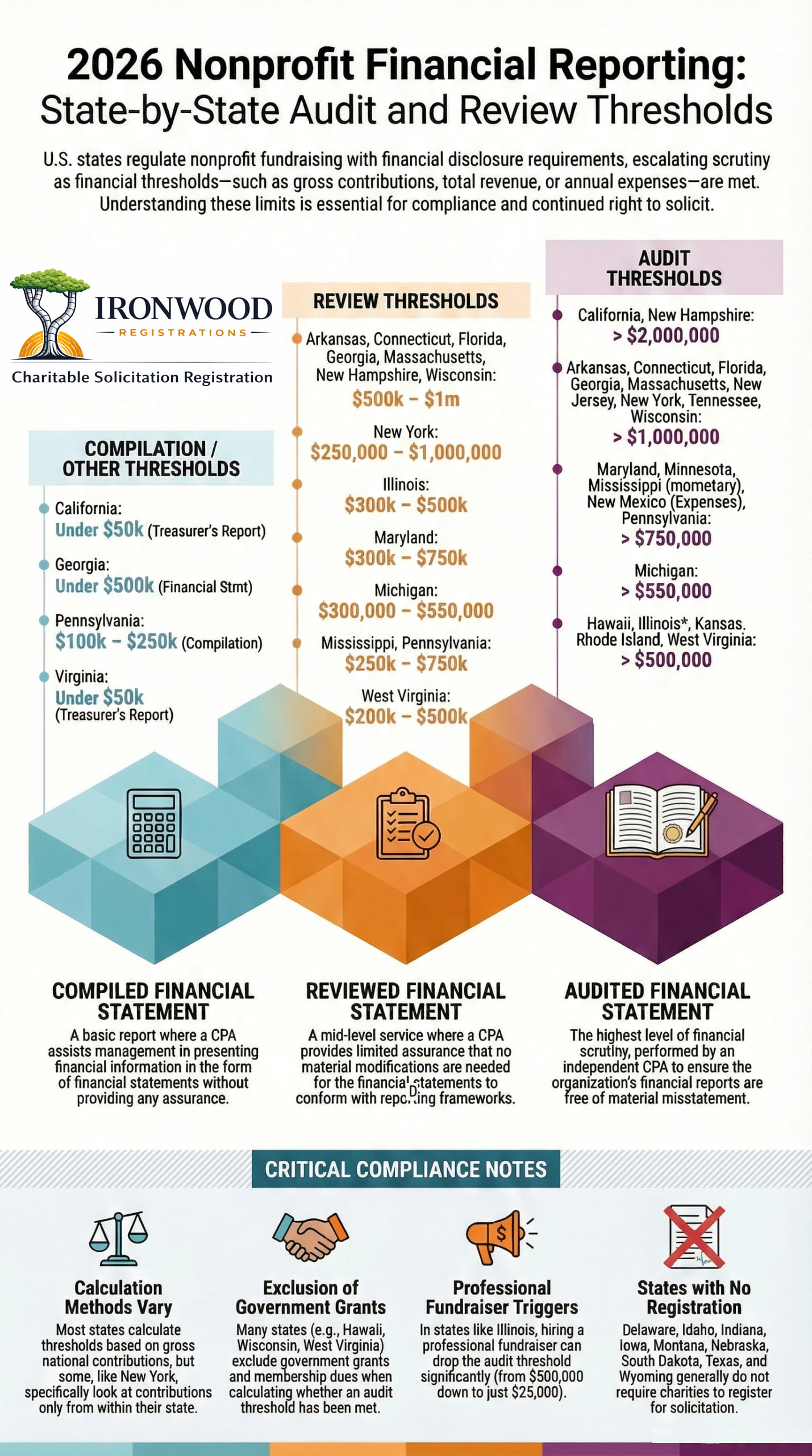 <img src=”https://www.ironwoodregistrations.com/wp-content/uploads/2026/02/charitable-registration-audit-thresholds-infographic.jpg” alt=”Nonprofit Renewal Deadlines Infographic”></a>